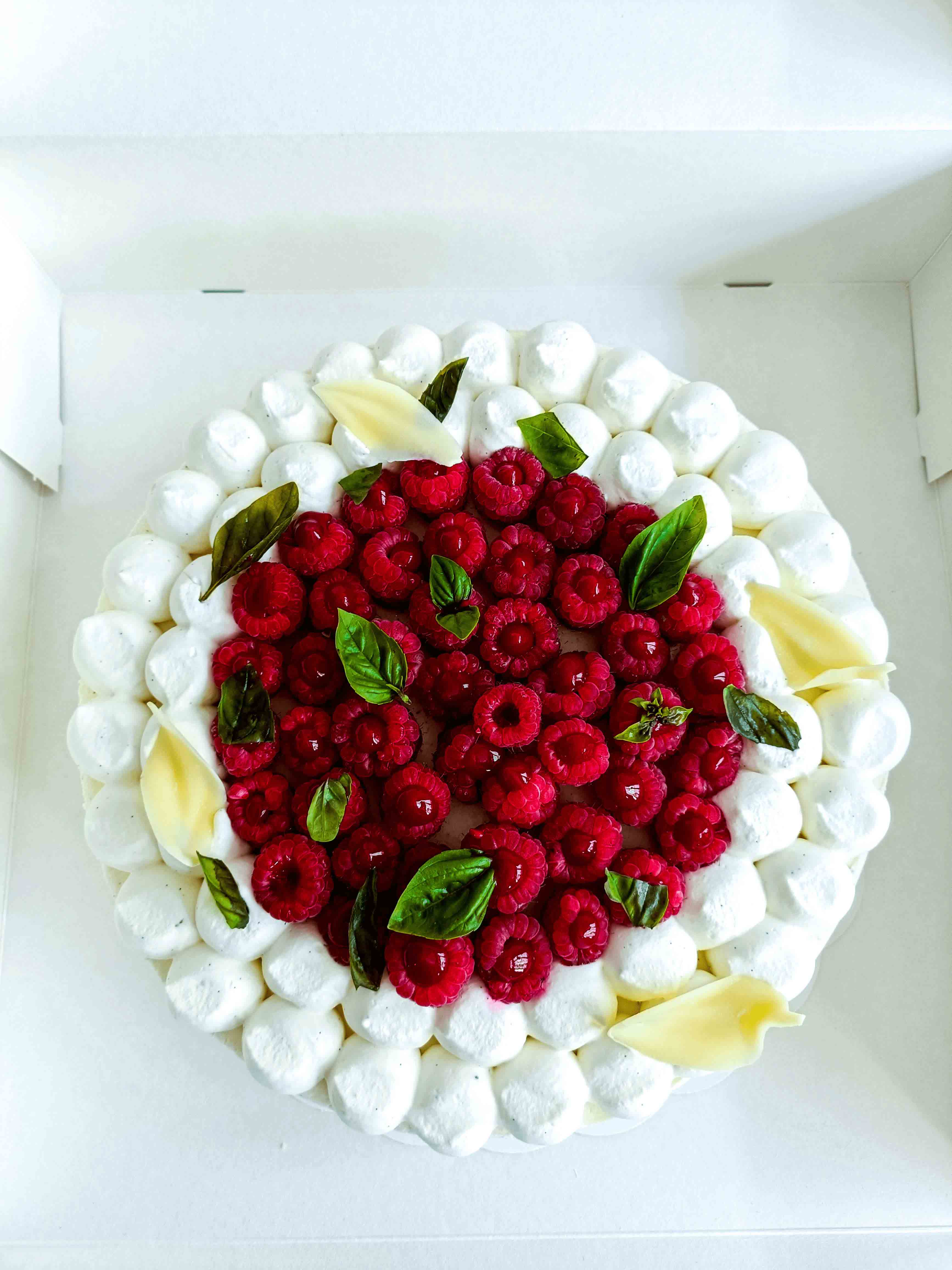Biscuit pain de Gênes aux amandes et écorces d’orange confites, confit de citron jaune au basilic, ganache montée à la vanille de Madagascar et au zeste de citron noir, gel aux agrumes, glaçage Magnum au chocolat blanc.